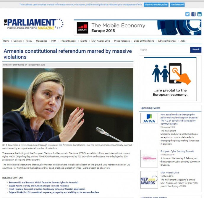 Avropa Parlamentinin “The Parliament” jurnalının son nömrəsində Sərhədsiz İnsan Hüquqları Təşkilatının direktoru Villi Fotrenin dekabrın 6-da Ermənistanda keçirilmiş referendumu sərt şəkildə tənqid edən məqaləsi dərc olunub.